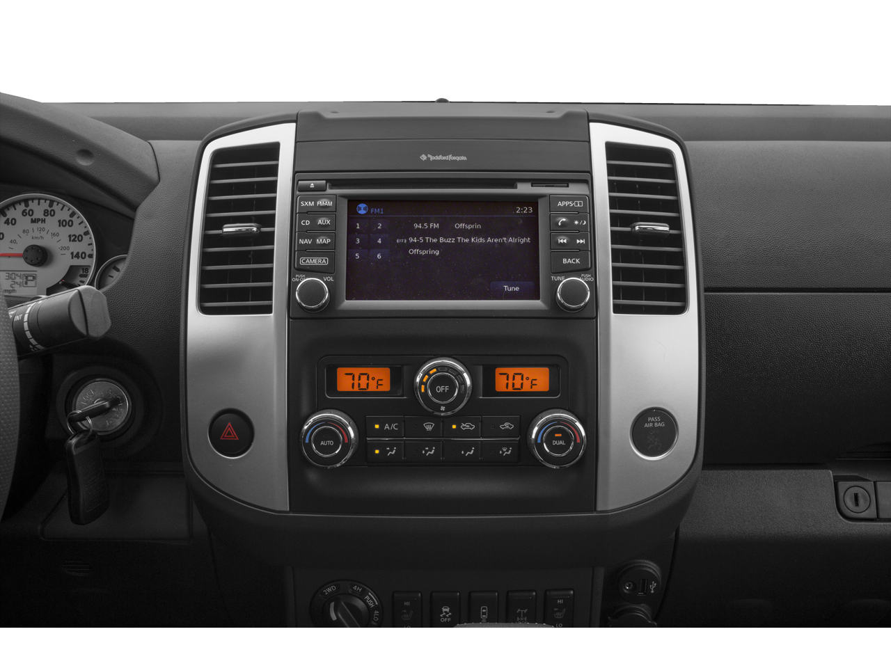 - Radio: Rockford Fosgate Premium Audio System -inc: CD player, 10 speakers w/subwoofer, NissanConnect w/navigation, 5.8" color touch screen display, Nissan Navigation System w/voice guidance, Nissan voice recognition for navigation and audio, SiriusXM satellite radio, SiriusXM traffic, SiriusXM travel link (fuel prices, weather, movie listings, stock info and sports), auxiliary input, steering wheel audio controls, USB connection port for iPod Interface and other compatible devices, streaming audio via Bluetooth®, Bluetooth® hands-free phone system, Siri Eyes Free and hands-free text messaging assistant
